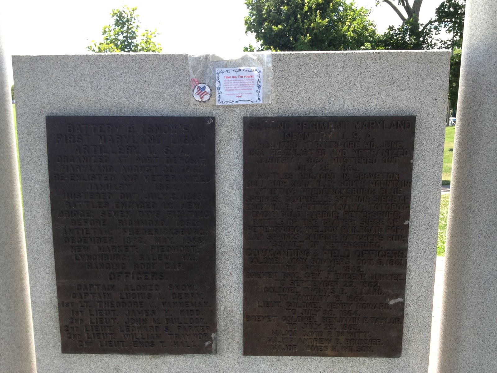 The weekend before July 4th, I abandoned this little patriotic star ornament that I finished in a small tartlet tin.  I left it on a monument at the Antietam National Battlefield in Sharpsburg, MD.  The very next day, I got a lovely e-mail from a history teacher from California who was visiting the battlefield with his family.  They found my abandoned ornament and were appreciative of the sentiment.  He said the battlefield was pretty somber and the ornament cheered them up.  He said it'd be displayed on their Christmas tree each year in fond memory of their trip to the Washington, D.C. area.